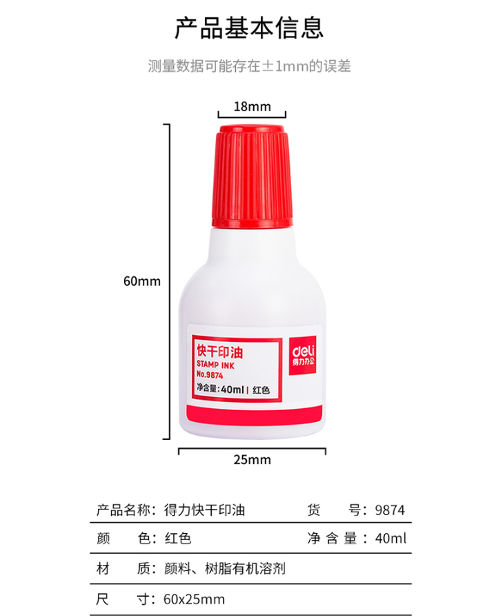 商品名稱:得力(deli)40ml財務(wù)印章快干清潔印油印泥 辦公用品 得力(deli)印油9874紅色