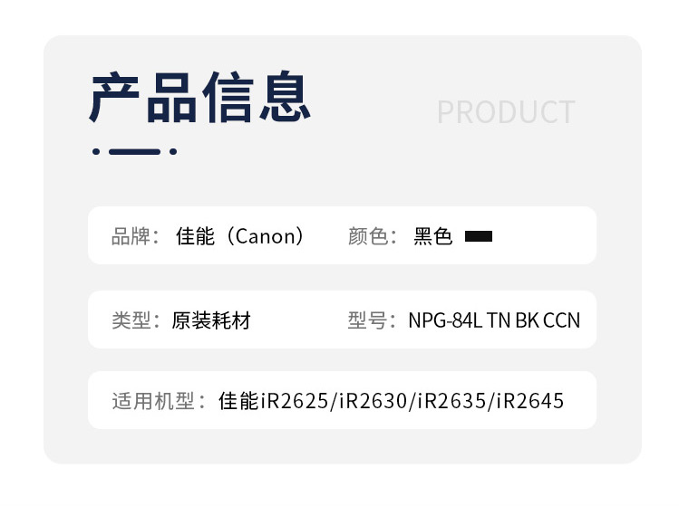 商品名稱:佳能(Canon)NPG-84L通用硒鼓,粉盒 黑色粉盒原裝低容量墨粉適用數(shù)碼復合機(iR2625/iR2630/iR2635/iR2645)