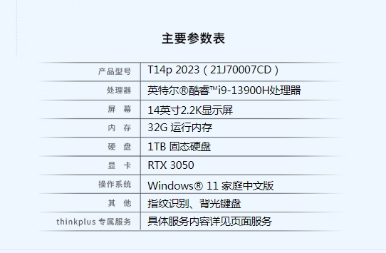 商品名稱:聯(lián)想(LENOVO )T14P 便攜式計算機 酷睿 I9-13900HX/32GB/1TB/無/獨立顯卡/4G/RTX 3050/14/Windows11