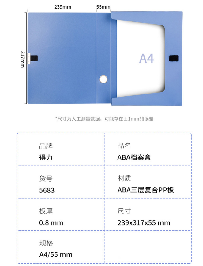 得力(deli)檔案盒A4塑料加厚文件盒辦公用品財(cái)務(wù)票據(jù)收納冊(cè) 得力(deli)中端款側(cè)寬55mm/5683 單個(gè)裝