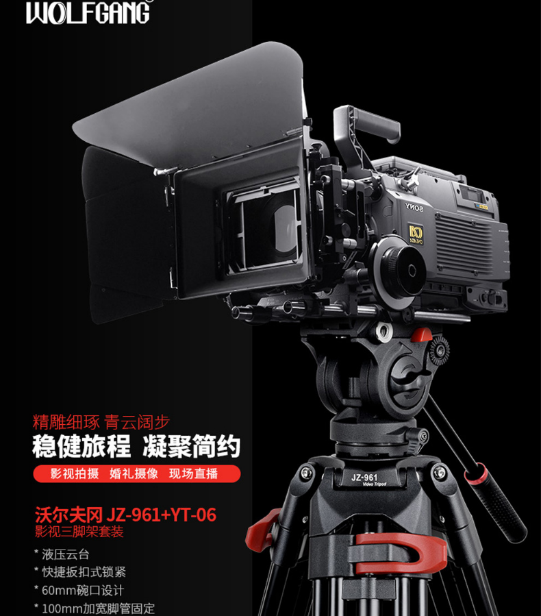 商品名稱:沃爾夫?qū)╓OLFGANG)JZ-965+YT08專業(yè)電影機攝影三腳架 地置穩(wěn)定 壓阻尼云臺支架套裝 稱重10KG 沃爾夫?qū)_架JZ-965