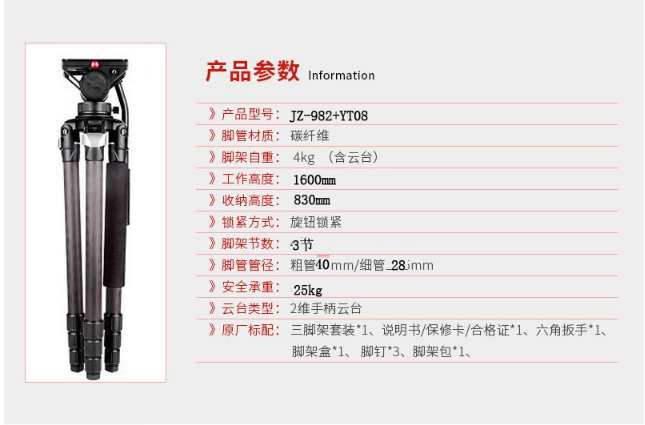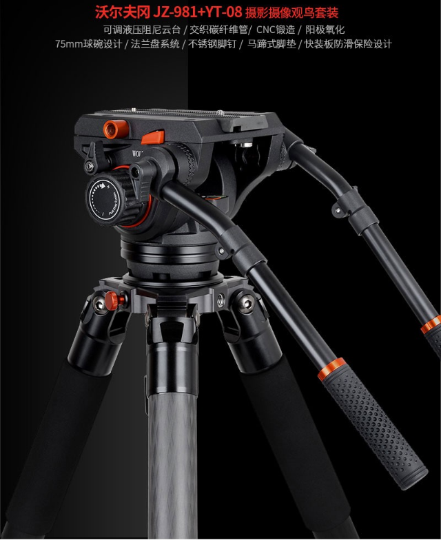 商品名稱:沃爾夫?qū)╓OLFGANG)JZ-982+YT08 碳纖維三腳架雙手柄液壓阻尼云臺(tái)碳纖維套裝3節(jié) 承重25kg 沃爾夫?qū)_架JZ-982
