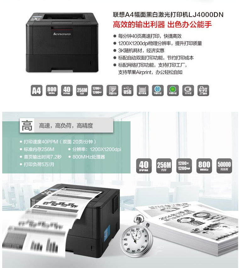 商品名稱(chēng):聯(lián)想(Lenovo)激光打印機(jī)LJ4000DN 黑白激光打印機(jī) 40頁(yè)/分鐘高速自動(dòng)雙面打印 辦公商用有線網(wǎng)絡(luò)打印